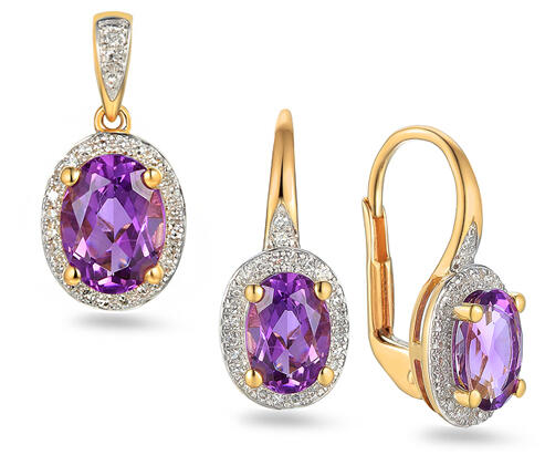 A gyémántokkal kirakott ametiszt Nyla egy csodálatos ékszer, amely ötvözi a finomságot és a különleges designt. A szett központi eleme egy 2,78 karátos természetes ametiszt, amelynek gyönyörű lila árnyalata kiemelkedik a meleg sárga arany hátteréből. A 0,22 ct összsúlyú, kiváló minőségű (H szín, SI1 tisztaság) gyémántok ragyogó fényt kölcsönöznek az ékszernek