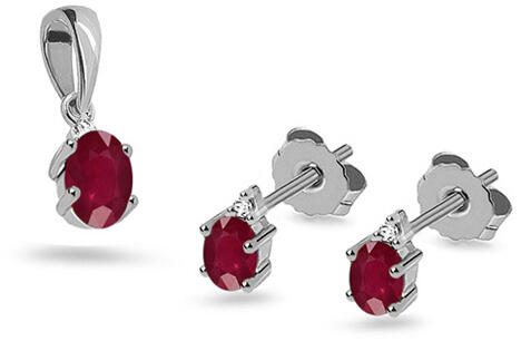 A rubinkészlet egy finom és ízléses ékszer. A 14 karátos fehér aranyba foglalt mélyvörös rubin és a 0,040 ct súlyú, apró, briliáns csiszolású gyémántok kombinációja finoman vonzza a tekintetet, és kifinomulttá teszi megjelenését. A fehér arany a vörös drágakövekkel együtt különösen a sötétebb hajú és hűvösebb bőrtónusú nőkön tűnik ki, és gyönyörű k