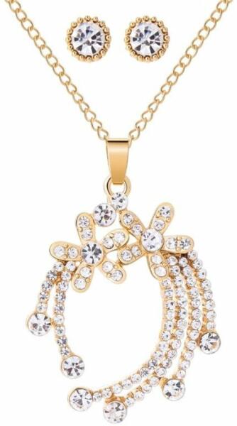 Színtelen köves nyaklánc és fülbevaló szett. Nyaklánc hossza: 47+5,5 cm, anyaga fémötvözet és kristály. Romantikus virág motívumos kristályokkal kirakott medál, egyszerű, mégis látványos kristályos fülbevaló. Egy jól megválasztott ékszer öltöztet, feldobja a napodat, valahányszor ránézel, jobb kedvre derülsz. A színekkel és anyagokkal manapság könnyű variálni
