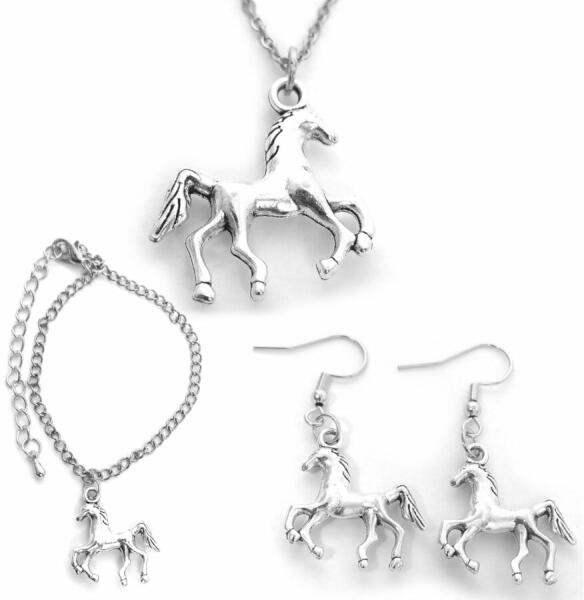 Lovas nyaklánc, fülbevaló és karkötő szett. Divatos kiegészítő azoknak, akik rajonganak a lovakért, esetleg a lovas divatkiegészítőket részesítik előnyben. A lovakból sohasem elég az igazi lovas rajongóknak, hiszen ebben az ékszerszettben négy darab lovas medálra is szert tehetsz, kettőt fülbevaló formában, egyet nyakláncra téve, és egyet a karkötődre. Lovas nyaklán