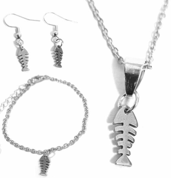 Halcsont nyaklánc, fülbevaló és karkötő szett. Paraméterek: Medál / mérete kb. 1,5 cm. Anyaga nemesacél. Fémrészek anyaga rozsdamentes acél. Elegáns, nem hivalkodó, diszkrét. – Lánc hossza 50 cm. (Ha ettől eltérő méretben szeretnéd, írd be megjegyzésbe!) – Karkötő hossza kb. 17+5 cm. (Ha ettől eltérő méretben szeretnéd, írd be megjegyzésbe!) – A fülbevaló a