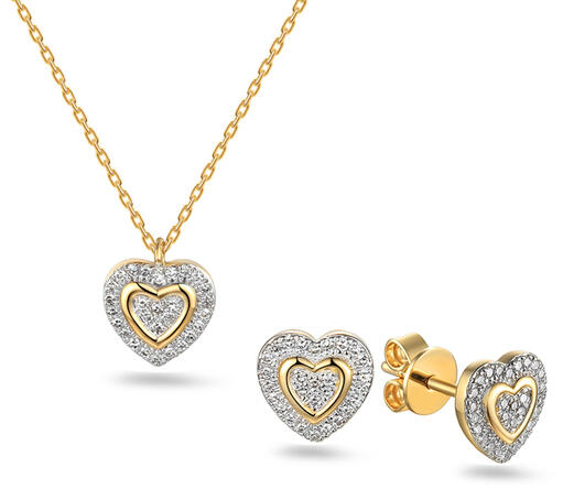 Ez a gyönyörű szív motívumos készlet vegyes aranyból készült, ami érdekes és kontrasztos megjelenést kölcsönöz az ékszereknek. A Diamond heart kollekció a szerelmet és a szenvedélyt szimbolizáló finom dizájnt hozza. A szív medál és fülbevaló összesen 0,150 ct súlyú gyémántokkal van díszítve. Könnyű súlyának köszönhetően az ékszerek kényelmesen viselhetők