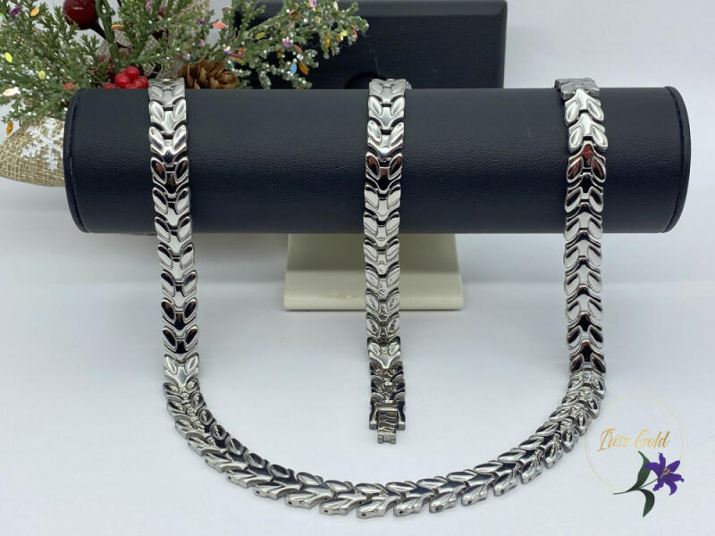 Gyönyörű ródium leveles szett Szin: rodium Méret: 48cm/10mm karkötő 21cm /10mm A forgalmazott divatékszerek alapanyaga nikkel és ólommentes ezért többnyire nem okoznak allergiás tüneteket, nyugodtan hordhatják fémérzékeny emberek is. Általában nem színezik a bőrt és más divatékszerekhez képest nagyságrendekkel jobb kopásállósággal rendelkeznek. A fehér (ezüst) szí