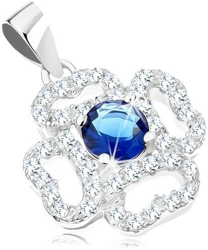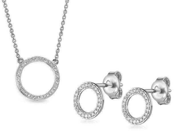 A 925 ezüst szettet egy medál és egy pár fülbevaló alkotja virág alakban, amelynek átlátszó cirkóniákkal kirakott szívecskés szirmai vannak, miközben a közepét egy kerek, sötétkék, csiszolt felületű cirkónia képezi. A fényes felületű medál hosszúkás láncra kerülő szemmel rendelkezik. A fülbevaló orosz-zár segítségével kapcsolódik. Medál méretei: 14 x 14 mm