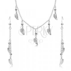 A szett 925 ezüstből készült, nyakék fülbevalóval. A láncon öt rögzített medál található. A lánc széles kerek láncszemekből épül. A medál egy fényes gömb és egy lapos angyalszárny vésett mintával. A nyaklánc delfinkapcsos. A fülbevaló kerek szemekből álló lánc, amelyen két, azonos mintájú medál függ - az egyik középen, a másik a lánc végén. Akasztós f