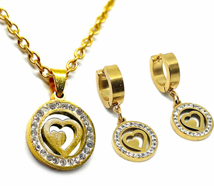 Kristályos nemesacél szív medál arany színű lánccal és fülbevalóval. Romantikus, letisztult szív medál, kifinomult ékszer szett, nem túl sok, nem túl kevés. Paraméterek: Medál mérete kb. 1,6x1,4 cm. Medál anyaga nemesacél és kristály. Fülbevaló rozsdamentes acél, mérete kb. 3,2 cm. Nyaklánc rozsdamentes acél: hossza 50 cm (ha más méretet szeretnél, megjegyzésbe ír