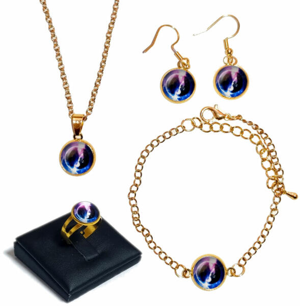 Világűr mintás (lánc, karkötő, fülbevaló, gyűrű) szett, arany és ezüst színben. Egyedi, szép, kézzel készült üveglencsés ékszerszett, akár ajándékba is ideális. (Az ezüst színű gyűrűről nincs fénykép, de van készleten. ) A szett tartalma: medál lánccal, fülbevaló, karkötő, állítható gyűrű. Rendelhető arany és ezüst színekben. Válaszd ki a listából