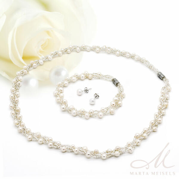 Tüneményesen szép, fehér édesvízi apró gyöngyökből és üveggyöngyökből font 3 részes vékony menyasszonyi ékszer szett. Nyaklánc hossza: 45 cm (mágneses kapocs) Karkötő hossza: 17,4 cm (mágneses kapocs) Fülbevaló mérete: 0,6 cm (ezüst bedugó) Egyik legnépszerűbb klasszikusmenyasszony ékszer szettünk, mely fülbevalót, nyakláncot és karkötőt is tartalmaz. A mágne