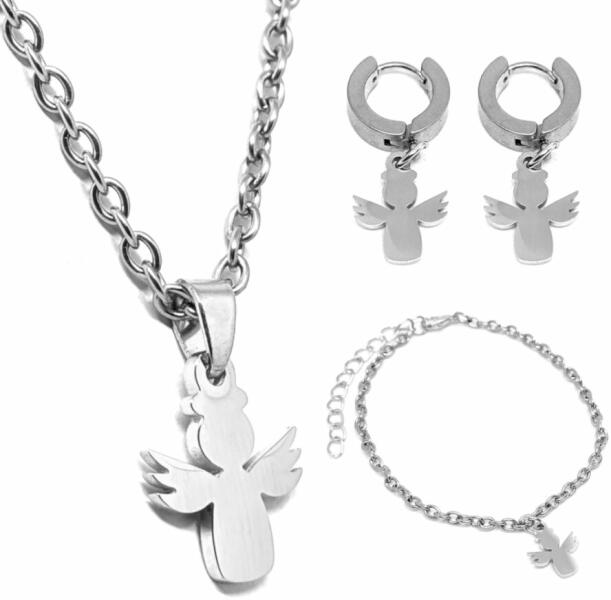 Angyal medálos nyaklánc, karkötő és fülbevaló szett, ezüst színű. Ajándéknak is kiváló, dobozban szállítjuk, Medál anyaga nemesacél, nyaklánc, karkötő és fülbevaló akasztó anyaga rozsdamentes acél. Medál mérete kb. 1,4 cm. Nyaklánc hossza 50 cm, ha eltérő méretet szeretnél, írd be megjegyzésbe . Karkötő mérete 17+5 cm. (Ha ettől eltérő méretet szeretnél,