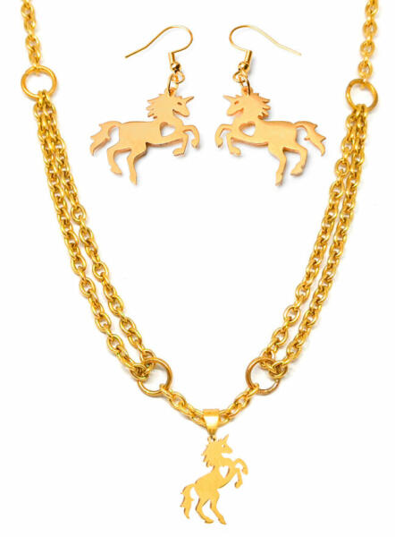 Az unikornisokat mindenki szereti, ábrázolásuk mindig más, ez a nyaklánc és fülbevaló elegánsabb unikornis, kecses és finoman nőies dizájn. A dupla nyaklánc vagány, kis kontraszttal a légies unikornissal. Arany színű, nemesacél lánc és medál. Unikornis nemesacél nyaklánc és fülbevaló szett, arany színű. Paraméterek: Medál / mérete kb. 2,5 cm. Fülbevaló kb. 4 cm. Me
