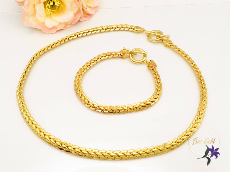 Antiallergén szett nyaklánc, karkötő . Fonott szemes Itali ékszer szett kissé hengeres alakú Szin: 18K Méret: 43 cm / 8 mm Karkötő: 19 cm / 8mm A forgalmazott divatékszerek alapanyaga nikkel és ólommentes ezért többnyire nem okoznak allergiás tüneteket, nyugodtan hordhatják fémérzékeny emberek is. Általában nem színezik a bőrt és más divatékszerekhez képest nagyságren