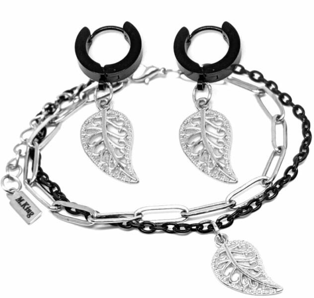 Áttört falevél charmos dupla karkötő. Paramé terek: Charm mérete 1,9x1 cm. Anyaga fémötvözet, karkötő anyaga rozsdamentes acél. Fülbevaló rozsdamentes acél, mérete kb. 3 cm. Karkötő mérete 17+5 cm. (Ha ettől eltérő méretet szeretnél, rendeléskor a MEGJEGYZÉSBE írd be. )