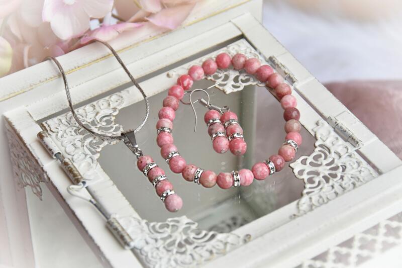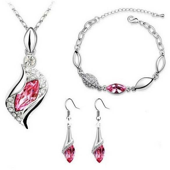 Cikkszám: 0818 Három részes ékszerszett (nyaklánc + fülbevaló + karlánc): - ezüst bevonattal, - rózsaszín és áttetsző kristályokkal, - akasztós fülbevalóval. Medál mérete: 3,7 cm x 1,4 cm. Nyaklánc hossza: 40 - 45 cm (állítható) Karlánc hossza: 18 - 22,5 cm (állítható) Fülbevaló hossza: 4,4 cm. Alapanyaga: minőségi fémötvözet. Gyönyörű, elegáns ékszerszett!