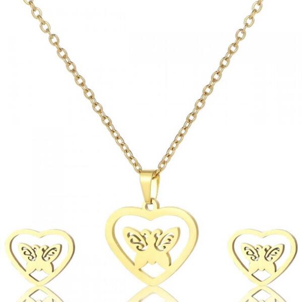 Nice Butterfly Szett Szépséges Nice Butterfly ékszerszett verhetetlen áron. A szett nyakláncot medállal és fülbevalót tartalmaz. Nem tartalmaz sem nikkelt, sem ólmot, sem kadmiumot, ezért érzékeny bőrű emberek is viselhetik. Tulajdonságok: A nyaklánc hossza: 36cm A medál mérete: 1,9cm x 1,6cm A fülbevaló mérete: 1cm x 0,8cm Szín: Arany Anyaga: Nemesacél