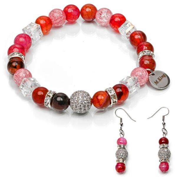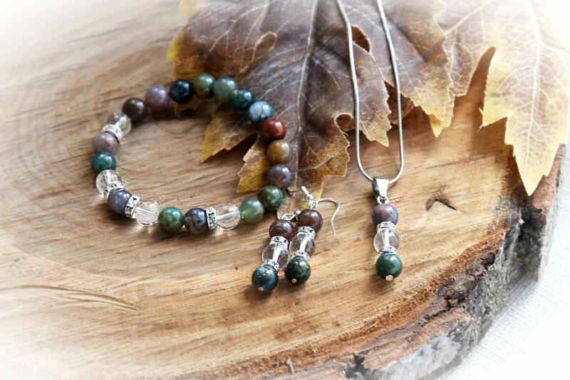 Indiai achát ásványból készült női karkötőből és fülbevalóból álló szett Gyöngyök mérete: 8 mm-es fazellált ásványgyöngyök Rugalmas, gumis ékszerdamil alapra készült Az Achát erős földelő ásványfajta. Támogatja a fizikai, szellemi és érzelmi egészségünk megfelelő működését. Erősíti a bizalom érzését. A karkötő mérete cm-ben választható. Az éks