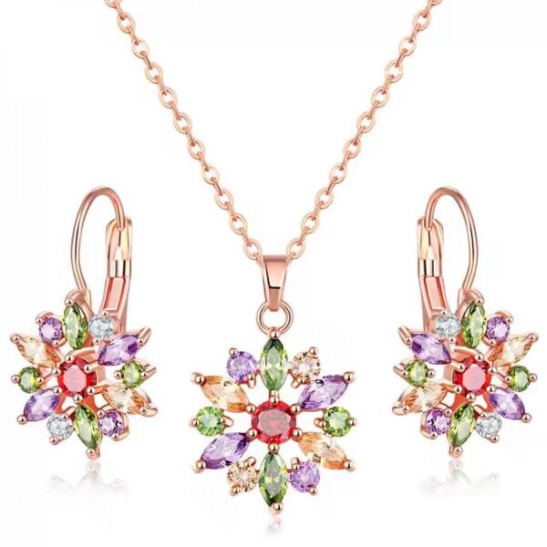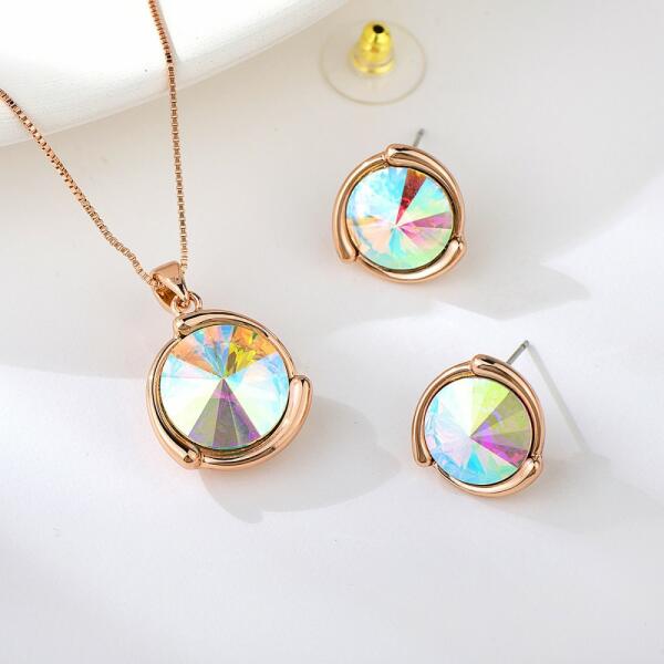 Cikkszám: 0710 Ékszerszett: - rózsaarany bevonattal, - színjátszó egyedi kristályokkal, - állítható hosszúságú lánccal ( 40 cm - 45 cm ), - 1 pár beszúrós fülbevalóval ( 1,3 cm-es ). Súlya: 20 g. Medál mérete: 2,5 cm x 1,6 cm ( az akasztós résszel) Gyönyörű, különlegesen szép divatékszer. A megadott méreteket kérjük vegyék figyelembe !
