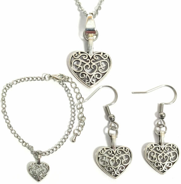 Díszes szív (2) nyaklánc, fülbevaló és karkötő szett. Paraméterek: Medál / mérete kb. 1,6 cm. Anyaga fémötvözet. Fémrészek anyaga rozsdamentes acél. Elegáns, nem hivalkodó, diszkrét. – Lánc hossza 50 cm. (Ha ettől eltérő méretben szeretnéd, írd be megjegyzésbe!) – Karkötő hossza kb. 17+5 cm. (Ha ettől eltérő méretben szeretnéd, írd be megjegyzésbe!) – A f