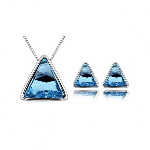 Háromszögek kristályos ékszer szett, fehér arany bevonattal. Ékszer alapféme: antiallergén nikkelmentes fém ötvözet, fehérarany bevonattal Lánc hossza: 400+50mm Medál mérete: 19x19mm Fülbevaló mérete: 19x19mm