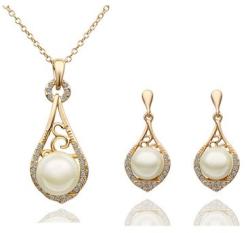 Cikkszám: 1618 2 részes ékszerszett: - arany bevonattal, - egyedi kristályos díszítéssel, - szimulált gyöngyökkel, - állítható hosszúságú lánccal (44 cm – 47 cm), - 1 pár beszúrós, függő fülbevalóval. Súlya: 10 g. A medál mérete: 3,5 cm x 2,7 cm. A fülbevaló mérete : 3 cm x 1,5 cm. Különleges, elegáns, gyöngyös-kristályos ékszer ! A megadott méreteket kérj
