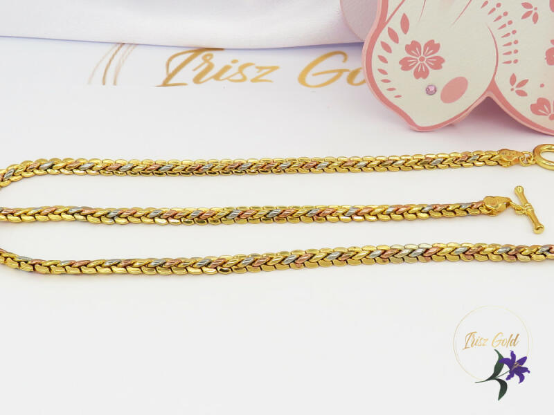 Antiallergén szett nyaklánc, karkötő Gyönyörű trikolor színben buzaszem formájú szemek fonott mintát adnak ki Nagyon szép mutatós Itali ékszer Méret: 44 cm/5mm Karkötő: 21 cm/ 5mm A forgalmazott divatékszerek alapanyaga nikkel és ólommentes ezért többnyire nem okoznak allergiás tüneteket, nyugodtan hordhatják fémérzékeny emberek is. Általában nem színezik a bőrt és