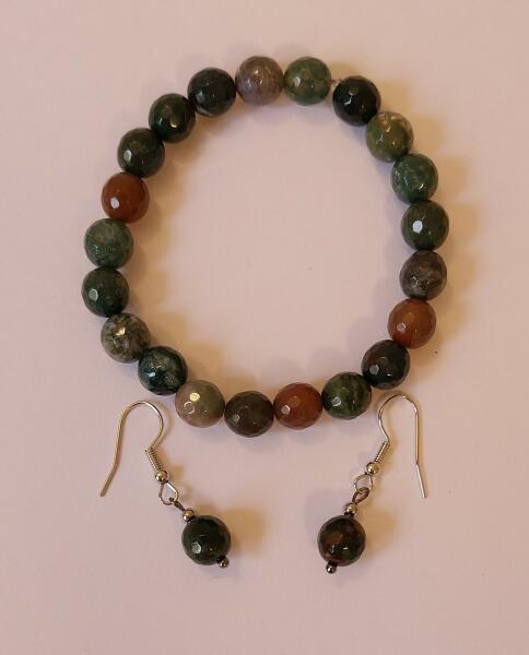Indiai achát ásványból készült női karkötőből és fülbevalóból álló szett Gyöngyök mérete: 8 mm-es fazellált ásványgyöngyök Rugalmas, gumis ékszerdamil alapra készült Az Achát erős földelő ásványfajta. Támogatja a fizikai, szellemi és érzelmi egészségünk megfelelő működését. Erősíti a bizalom érzését. A karkötő mérete cm-ben választható. Az éks
