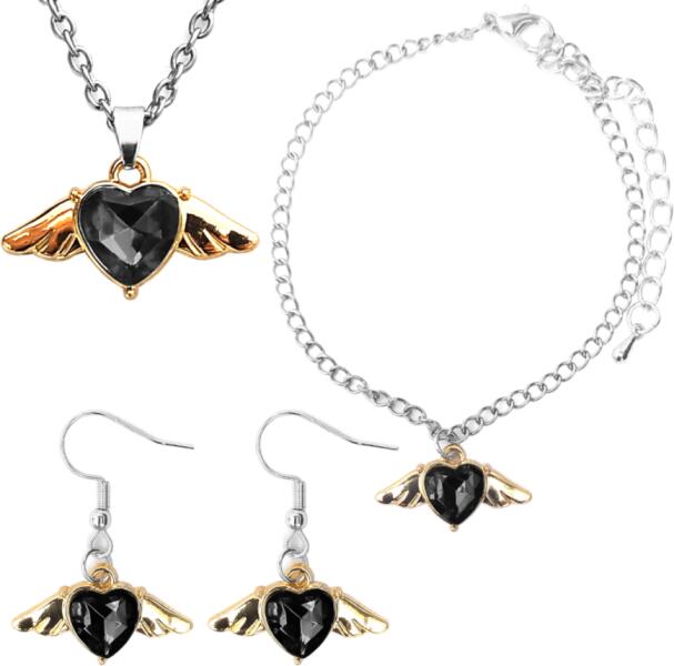 Fekete kristály szív angyalszárnnyal nyaklánc, karkötő és fülbevaló szett. Paraméterek: Medál / mérete kb. 2,5 cm. Anyaga fémötvözet. Fémrészek anyaga rozsdamentes acél. Elegáns, nem hivalkodó, diszkrét. – Lánc hossza 50 cm. (Ha ettől eltérő méretben szeretnéd, írd be megjegyzésbe!) – Karkötő hossza kb. 17+5 cm. (Ha ettől eltérő méretben szeretnéd, írd be m