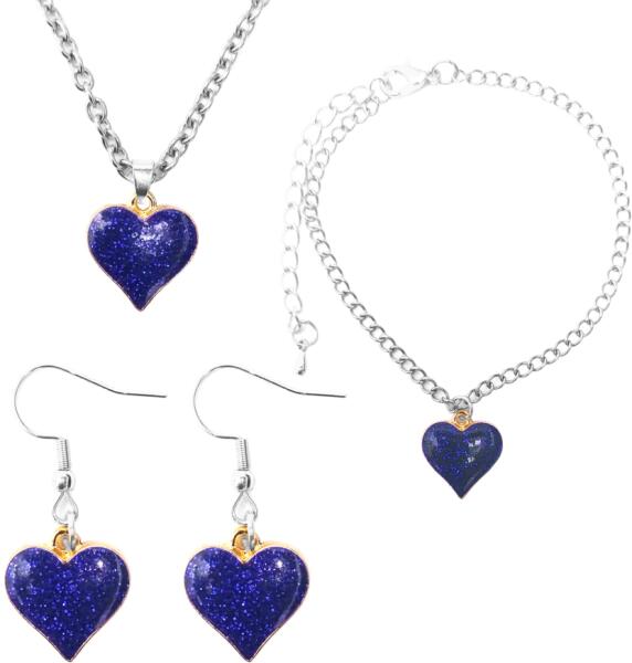 Kék csillogó szív nyaklánc, karkötő és fülbevaló szett. Paraméterek: Medál / mérete kb. 1,7 cm. Anyaga fémötvözet. Fémrészek anyaga rozsdamentes acél. Elegáns, nem hivalkodó, diszkrét. – Lánc hossza 50 cm. (Ha ettől eltérő méretben szeretnéd, írd be megjegyzésbe!) – Karkötő hossza kb. 17+5 cm. (Ha ettől eltérő méretben szeretnéd, írd be megjegyzésbe!) –