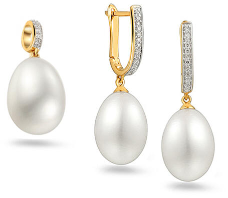Ez az elegáns gyémántkészlet a klasszikus szépség és kifinomultság megtestesítője, különösen a menyasszonyok és a különleges ékszereket kereső nők számára tökéletes. A gyöngyszett egy medálból és egy fülbevalóból áll. Fehér színű, 7 mm átmérőjű Biwa gyöngyökkel van díszítve. A szettbe 0,100 ct összsúlyú, H színű és SI1 tisztaságú gyémánt van bera