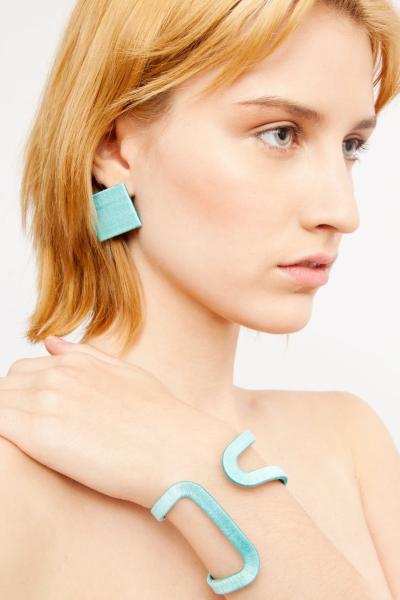 Újrahasznosított műanyagból és hímzőfonalból készült fülbevaló és karkötő.