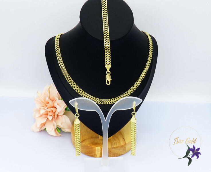 Antiallergén bismark szemes szettnyaklánc, fülbevaló, karkötő Szin: 14K Méret: Lánc 45cm/6mm Karkötő :19cm/6mm Fülbevaló: 7cm/6mm A forgalmazott divatékszerek alapanyaga nikkel és ólommentes ezért többnyire nem okoznak allergiás tüneteket, nyugodtan hordhatják fémérzékeny emberek is. Általában nem színezik a bőrt és más divatékszerekhez képest nagyságrendekkel jobb