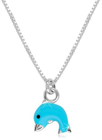 A két részes 925 ezüst szett egy nyakláncból és fülbevalóból áll. Ugró delfin motívum díszíti, amelyet fényes kék fénymáz és egy fekete szem díszít. Az uszonyait és a fejének egy részét ezüst szín dekorálja. A medált nem lehet levenni a szögletes láncról. Nyaklánc rugós karika kapoccsal. Fülbevaló stekkeres zárszerkezettel. A fülbevaló mérete: 7 x 6 mmA fül