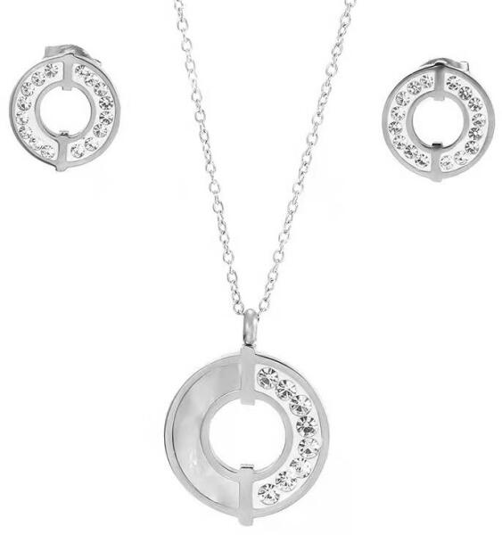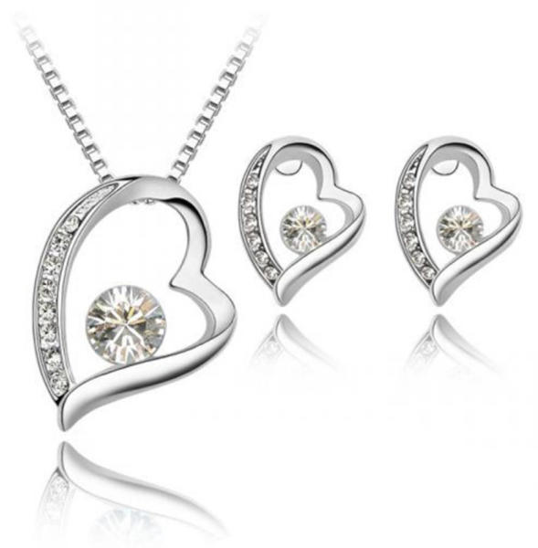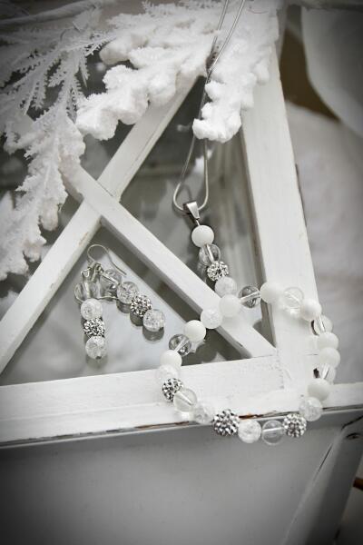 Igazán romantikus, arany bevonattal készült, hófehér, apró kristályokkal és nagyobb, crystal kristályokkal kirakott ékszer szett, mely 1 pár fülbevalót, 1 nyakláncot és 1 medált tartalmaz. A medálon a kis szív ívelt részén kisebb, szépen csiszolt fehér kristályok csillognak, míg a romantikus hatást tovább fokozza a gyönyörűen megcsiszolt fehér kristály, mely fülbev