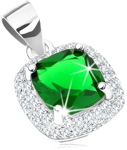 Ródiummal ellátott szett - medál és fülbevaló 925 ezüstből, mely smaragdzöld cirkóniás négyzetből áll lekerekített sarkakkal, melyek felszíne csillogó és csiszolt. A négyzet körül kettős szegély húzódik apró átlátszó cirkóniás beültetéssel. A medál láncra kerülő szeme sima. A fülbevaló kapcsolása stekkeres. Medál mérete: 10 x 10 mmLáncra kerülő szem sz