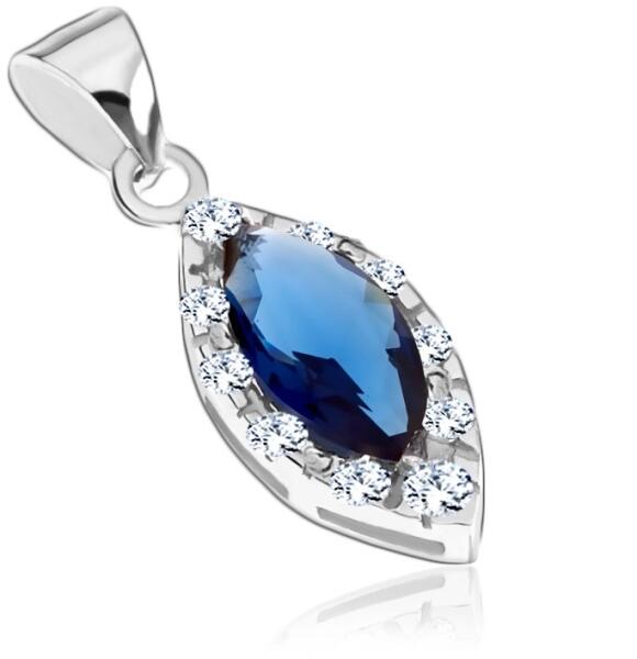 925 ezüst szett fülbevalóból és medálból, amelyek magszem körvonal alakúak átlátszó cirkóniákkal kirakva. A körvonalba egy sötétkék cirkónia van ültetve szintén magszem alakban. Az oldalak szűk téglalap alakú kivágásokkal díszítettek. A láncra kerülő szem fényes és sima a fülbevaló viselését pedig stekker biztosítja. A lánccsat fényes és sima, a fülbevaló