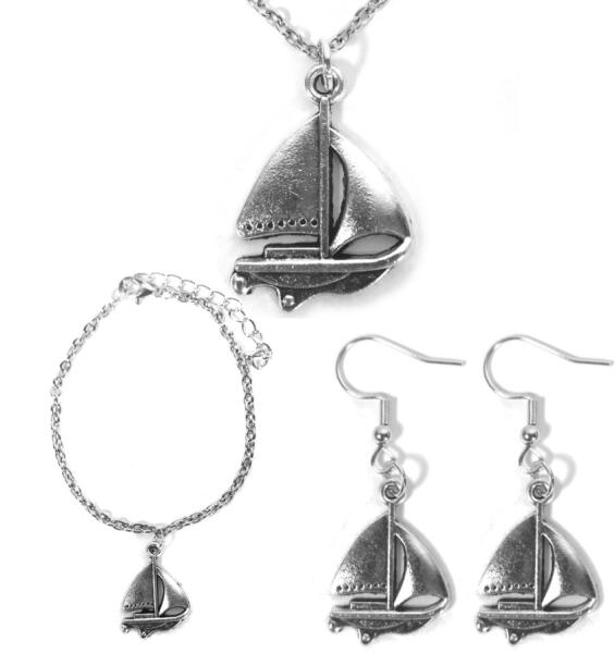 Vitorlás nyaklánc, fülbevaló és karkötő szett. Paraméterek: Medál / mérete kb. 2,4 cm. Anyaga fémötvözet. Fémrészek anyaga rozsdamentes acél. Elegáns, nem hivalkodó, diszkrét. – Lánc hossza 50 cm. (Ha ettől eltérő méretben szeretnéd, írd be megjegyzésbe!) – Karkötő hossza kb. 17+5 cm. (Ha ettől eltérő méretben szeretnéd, írd be megjegyzésbe!) – A fülbeval
