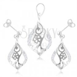 A 925 ezüst szett fülbevalóból és medálból áll, amelyek csillogó csepp formák körvonala hegyes alsó résszel. A körvonalak oldalait beültetett átlátszó cirkóniák díszítik és közepükben egy futó virág húzódik. A fülbevaló biztonságos viselését stekker teszi lehetővé. Fülbevaló méretei: 10 x 23 mmFülbevaló súlya: 2,1 gMedál méretei: 13 x 22 mmMedál súlya: