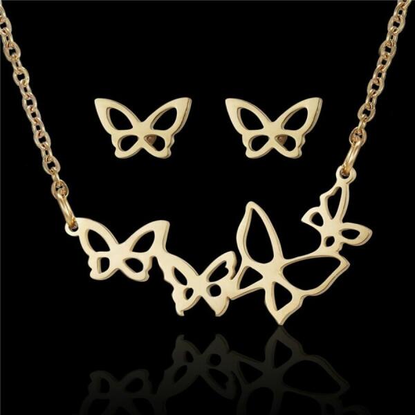 Nemesacél pillangós medál nyaklánccal és fülbevalóval. Nyaklánc hossza kb. 45 cm, medál kb. 3 cm, fülbevaló kb. 0,8 cm. Egy jól megválasztott ékszer öltöztet, feldobja a napodat, valahányszor ránézel, jobb kedvre derülsz. A színekkel és anyagokkal manapság könnyű variálni a különböző stílusokat, nem kell ragaszkodni a hagyományos szettekhez, nem feltétlenül kell a
