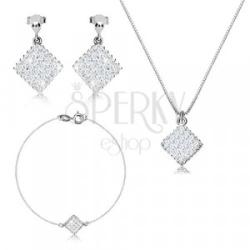 A 925 ezüst szett egy nyakláncból, egy karkötőből és fülbevalóból áll. A nyaklánc egy szögletes láncból és egy medálból áll, amely szabadon mozog a láncon. A láncot üreges kockák alkotják, amelyek egymásra merőlegesen vannak összekapcsolva. A medál rombusz alakú. Az eleje átlátszó kerek cirkóniákkal van kirakva. A medál széle díszes szegéllyel rendelkezik. A k