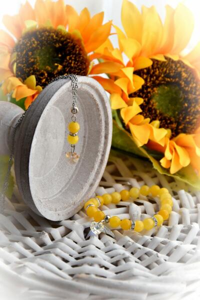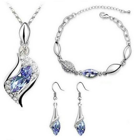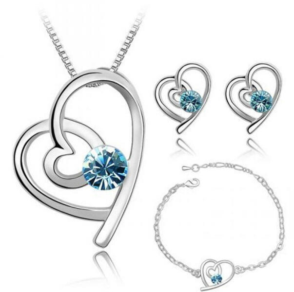 Kifinomult, ízléses, romantikus hangulatú kiegészítő . Szív alakú, világoskék kristályokkal ékesített, fehér arannyal bevont ezüstszín ékszerszett, amely 1 pár fülbevalót, 1 karkötőt, 1 nyakláncot és 1 medált tartalmaz. A szett mindhárom ékszerén egy nagyobb, csodás ívű szív foglal magába egy kisebbet. A belső motívum alsó csücskén egy szépen megcsiszolt, ké