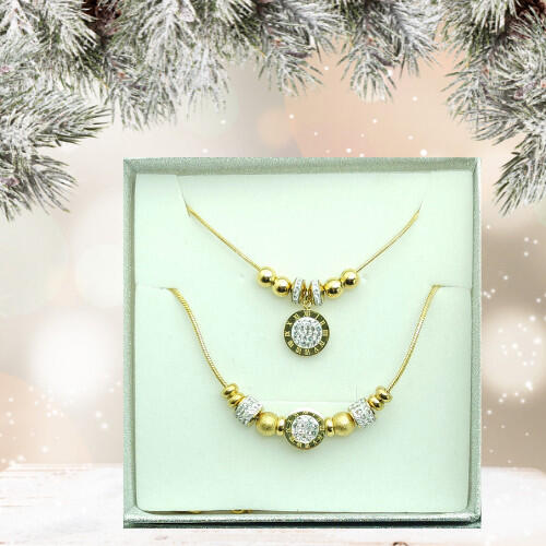 Aranyszínű nemesacél ( 316L ) pandora jellegű nyaklánc és karkötő, melyet fehér cirkónia kristályok tesznek csillogóvá. A kristályok ragasztott foglalatban helyezkednek el. Mutatós, különleges darab. Tartós, időtálló ékszer, nem feketedik, nem színezi a bőrt. Antiallergén ékszer. 14K arany színben kapható. Karkötő hossza: 17,5 cm + 4 cm hosszabbító. Karkötő széle