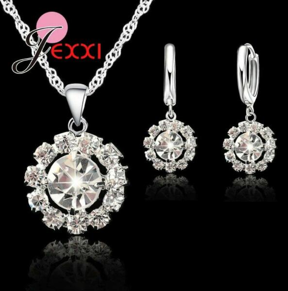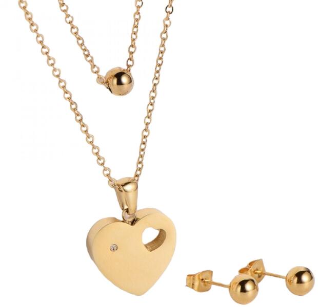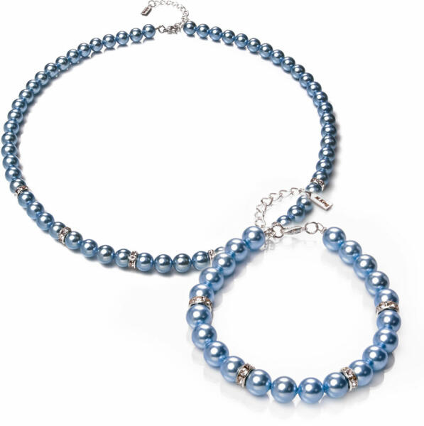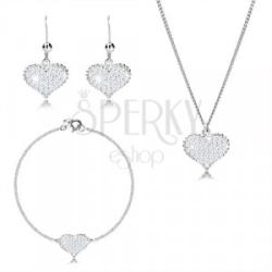 925 ezüst szett, amely karkötőből, fülbevalóból és nyakékből áll. A nyakéken elhelyezett medál mozgatható. A láncot egyforma, ovális alakú szemek alkotják, amelyek szorosan egymáshoz kapcsolódnak. A szív medál elülső oldalát csillogó cirkóniák díszítik, átlátszó változatban. A karkötőn a medál rögzített. A nyaklánc és a karkötő zárszerkezete delfinkapcso