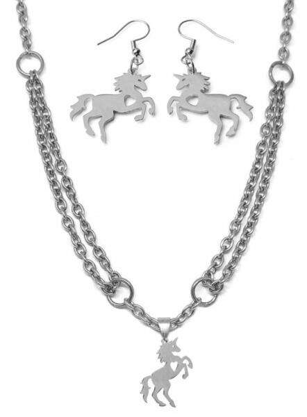 Az unikornisokat mindenki szereti, ábrázolásuk mindig más, ez a nyaklánc és fülbevaló elegánsabb unikornis, kecses és finoman nőies dizájn. A dupla nyaklánc vagány, kis kontraszttal a légies unikornissal. Ezüst színű, nemesacél lánc és medál. Unikornis nemesacél nyaklánc és fülbevaló szett, ezüst színű. Paraméterek: Medál / mérete kb. 2,5 cm. Fülbevaló kb. 4 cm.