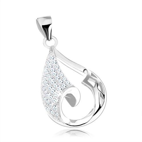 925 ezüst szett medállal és fülbevalóval nagy könnycsepp alakban aszimmetrikus kivágással. A kivágásba egy nagyobb csúcsos rész ér bele átlátszó cirkóniákkal kirakva és egy kisebb szintén csúcsos rész apró háromszög alakú kivágásokkal. Biztonságos viselését stekker biztosítja. A medál méretei: 12 x 19 mm A medál súlya: 1,63 g A láncra kerülő szem szélessége