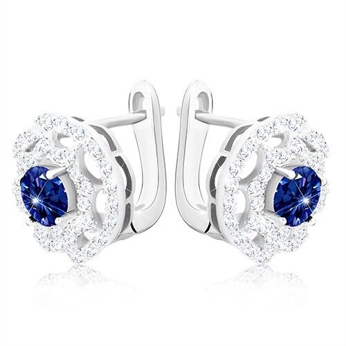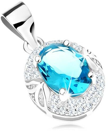 Fülbevaló és medál szett 925 ezüstből, ródiumozott felülettel. Egy ovális, csiszolt cirkónia élénk kék színben, amelyet kettős cirkónia szegély és gravírozott levél vesz körbe. A medál felső részén található a láncra kerülő szem, amely felülete fényes. A fülbevaló viselését stekker teszi lehetővé. Medál mérete: 10 x 11 mmLáncra kerülő szem szélessége: 3