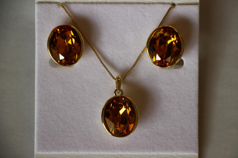 Cikkszám: 0837 Ékszerszett: - arany bevonattal, - borostyánszínű ausztriai kristályokkal, - állítható hosszúságú lánccal (40 cm - 45 cm), - beszúrós, hátul biztonsági kapcsos fülbevalóval ( 2 cm x 1,7 cm). Súlya: 12 g. A medál mérete az akasztós résszel: 2,6 cm x 1,7 cm. Nagyon elegáns, divatos, kristályos ékszer ! A megadott méreteket kérjük vegyék figyelembe !