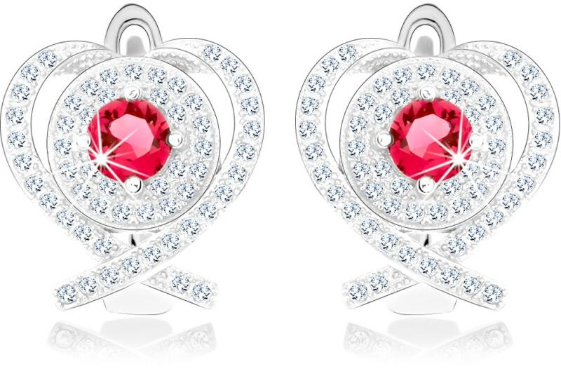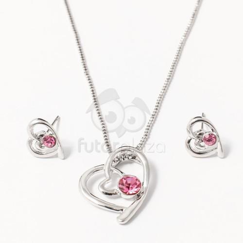 Szett fülbevalóból és medálból 925 ezüstből szív kontúr alakban keresztezett alsó végekkel. A körvonalba egy kör van helyezve beültetett sötétrózsaszín cirkóniával. A szív kontúr és a kör is átlátszó cirkóniákkal vannak kirkava. A láncra kerülő szem sima és fényes, a fülbevaló pedig pattintós kapoccsal záródik. Ródiumozott felület. A medál méretei: 15,5