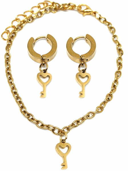 Szív Kulcs charmos karkötő és fülbevaló szett, arany színű. Paraméterek: Charm mérete 1,2 cm. Anyaga nemesacél, karkötő anyaga rozsdamentes acél. Fülbevaló rozsdamentes acél, mérete kb. 3 cm. Karkötő mérete 17+5 cm. (Ha ettől eltérő méretet szeretnél, rendeléskor a MEGJEGYZÉSBE írd be. )