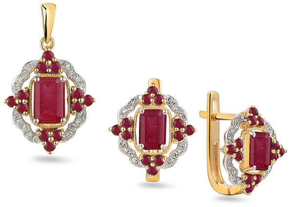 14 karátos kombinált aranyból készült egyedi gyémántkészlet rubinnal díszítve. A készlet medálos fülbevalókból áll, amelyeket egy gyönyörű, 2000 ct súlyú vörös rubin díszít. A rubinok megjelenését a H színű és tiszta SI1 gyémántok ligatúrája is kiemeli, amelynek súlya 0,140 ct. A gyémántok iZlato® eredetiségigazolással rendelkeznek.