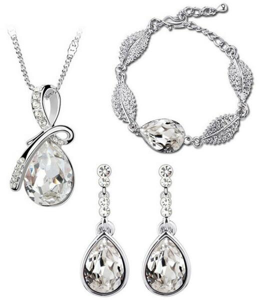 Cikkszám: 0487 3 részes ékszerszett: - áttetsző ausztriai kristályokkal, - ezüst színű bevonattal, - állítható hosszúságú nyaklánccal ( 40 cm - 45 cm ). A beszúrós, függő fülbevaló mérete: 4 cm x 1 cm . Medál mérete: 3 cm x 1,6 cm. Karlánc mérete: 13,5 cm + 5 cm (állítható). Elegáns, egyedi kristályos ékszerszett ! A megadott méreteket kérjük vegyék figyelembe