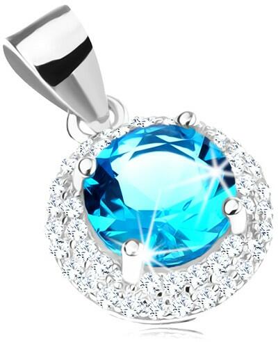 925 ezüst szett medálból és fülbevalóból kerek akvamarinkék színű cirkóniával, csiszolt és csillogó felszínnel, melyet szélesebb átlátszó cirkónákkal kirakott szegély vesz körül. A láncra kerülő szem felszíne sima és felfelé haladva enyhén szélesedik. A fülbevaló kapcsolása stekkeres. Medál átmérője: 10 mmLáncra kerülő szem szélessége: 3 mmMedál súlya: